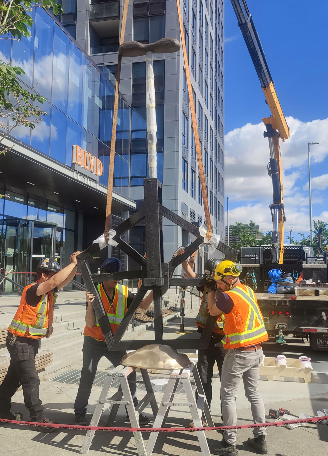 Balancing Act comprises three oversized unicycles perched precariously atop rock-type formations that frame the front entrance of BLVD Beltline, a premium rental property located in the heart of downtown Calgary. The artwork playfully explores ideas of imagined spectacle and a desired state of balance while acknowledging the neighbourhood’s histories and the site’s proximity to Stampede Park and East Victoria Park.